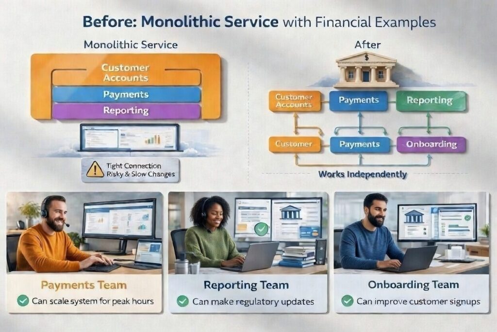 Think of a bank as a collection of different services: customer accounts, payments, reporting, and onboarding. In traditional systems, all these services are tightly connected, changing one area often affects everything else, which can be slow and risky.